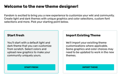 Kiedy przejdziecie do FandomDesktopu jako administratorzy, odwiedzenie Kreatora motywu zaprezentuje wam okno wyboru. Możecie albo zaimportować dotychczasowy motyw, albo zacząć projektować od początku. Jeżeli wybierzecie drugą opcję, damy wam czyste konto i pozwolimy odkryć nowe doświadczenie Kreatora motywu bez żadnych poprzednich decyzji dotyczących motywów, które staną się częścią waszego wstępnego designu FandomDesktopu.