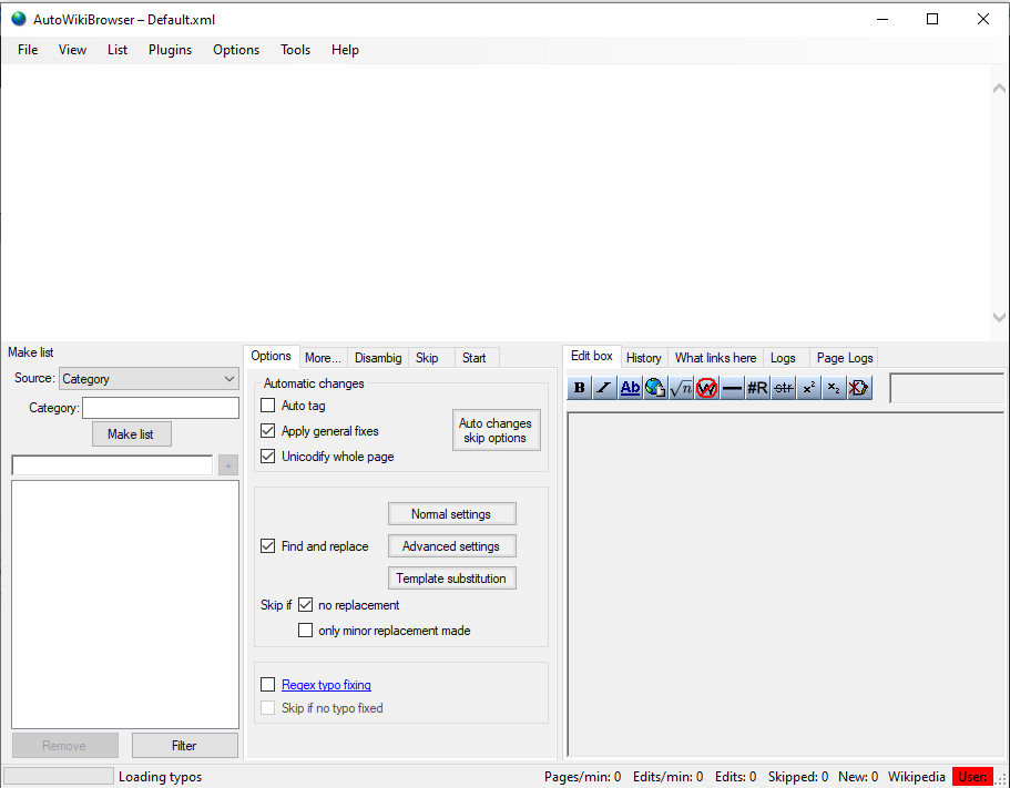 - Czy „Apply Changes Automatically” w zakładce Options jest zaznaczone? Jeśli nie — AWB będzie robić null edity zamiast zapisywać zmiany.
