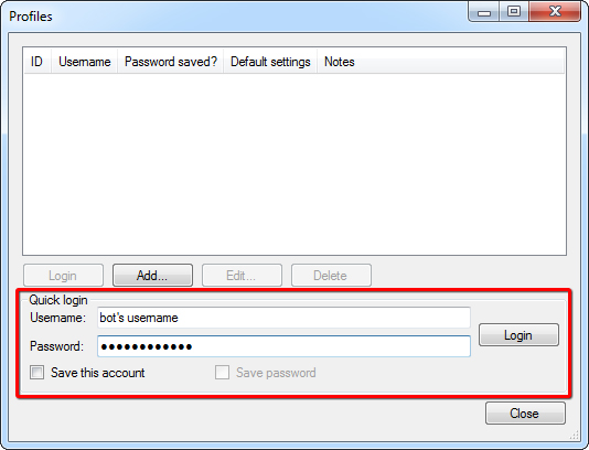 - Wpisz nazwę użytkownika oraz hasło bota.