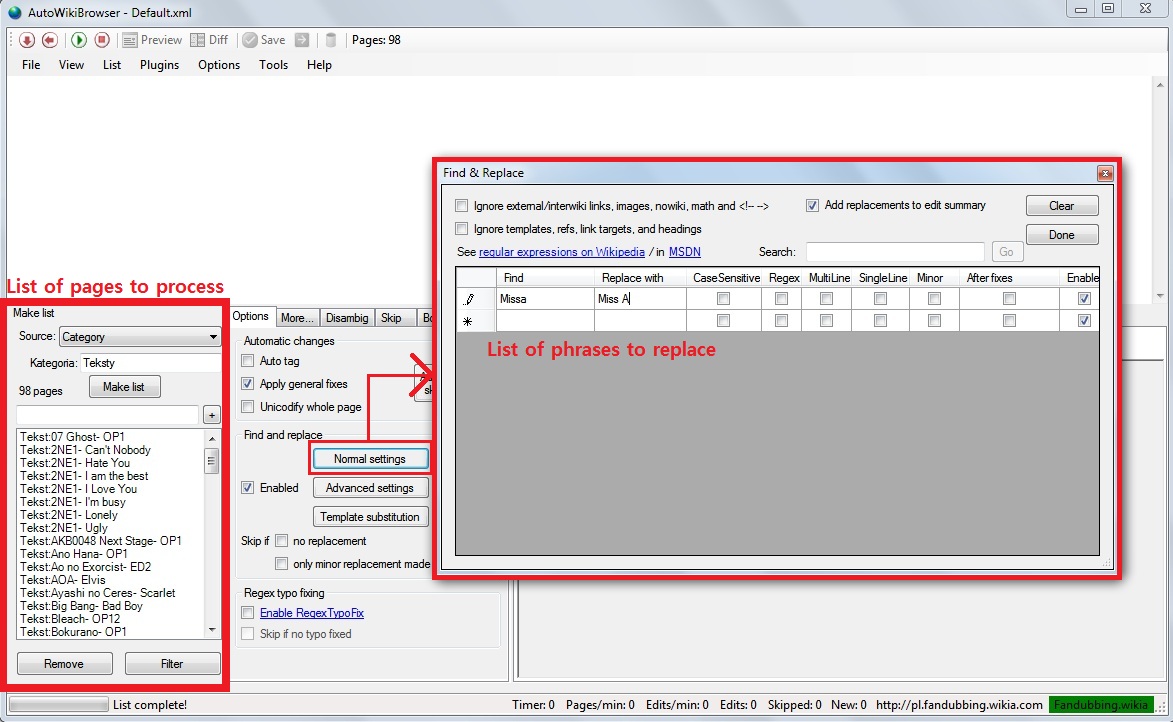 Gdy mamy wygenerowaną listę stron do sprawdzenia, trzeba powiedzieć botowi, co ma zrobić. Obok panelu „Make list” znajduje się sekcja głównych ustawień edycji.