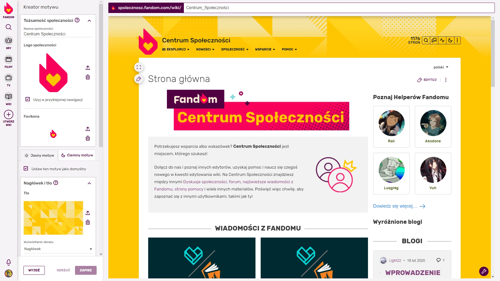 Najprostszym sposobem na dostosowanie wiki i upewnienie się, że nie wypłynie to na ewentualne zmiany ze strny Fandomu to użycie kreatora motywu. Pozwala on na dostosowywania takich rzeczy jak logo, kolorystyka i tło Twojej wiki w szybki i łatwy sposób.