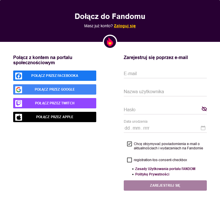 Tworzenie konta jest proste i bezpłatne. Daje również wiele dodatkowych możliwości, których nie posiadają niezalogowani użytkownicy. Twoje konto może być używane na każdej wiki Fandomu, więc wystarczy, że założysz je raz, a będziesz mógł z niego korzystać na każdym projekcie na serwerach Fandomu.