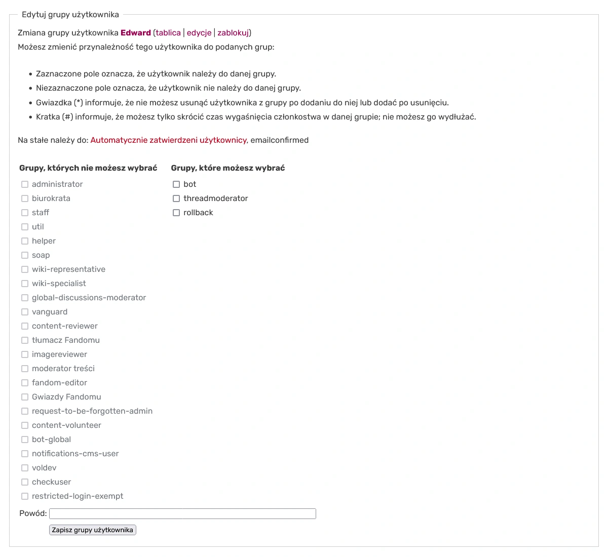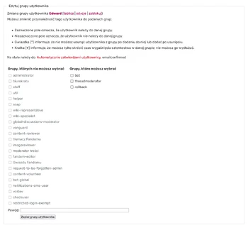 Aby dodać lub usunąć użytkownika z danej grupy, użyj strony: Specjalna:Uprawnienia.